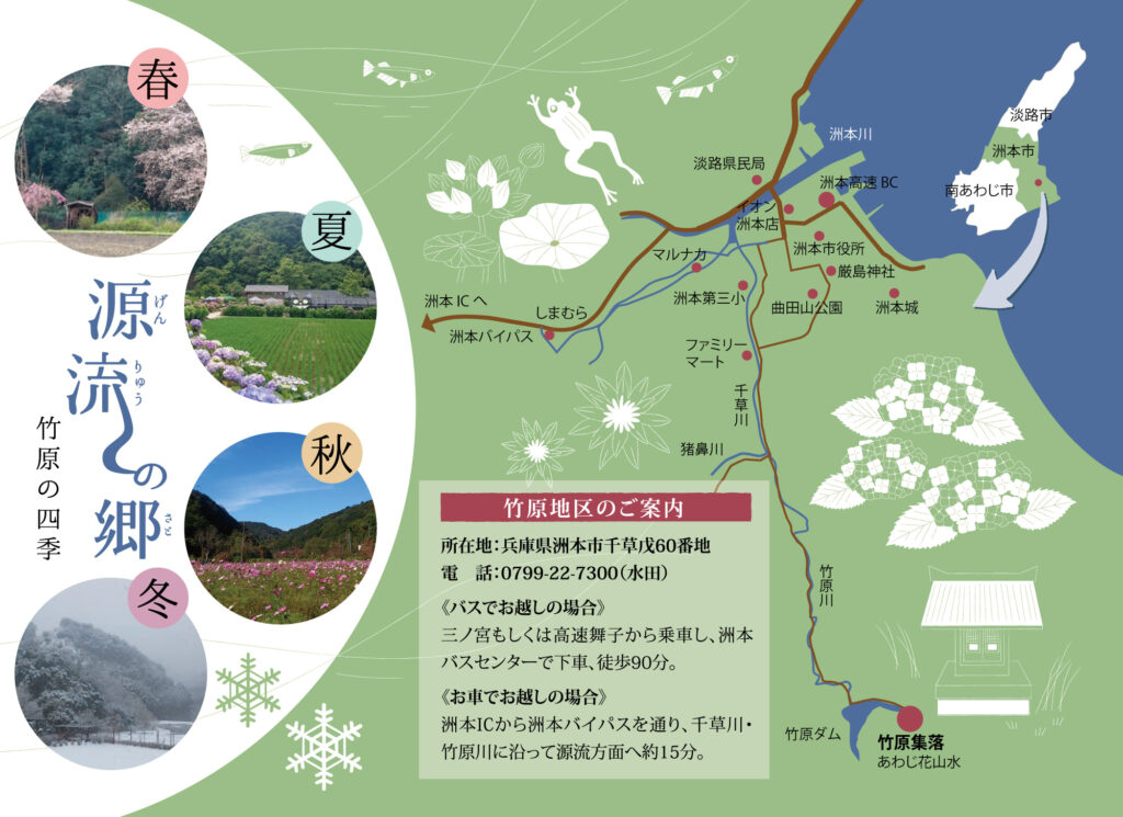 洲本ICから洲本バイパスを通り、千草川・竹原川にそって源流方面へ約15分