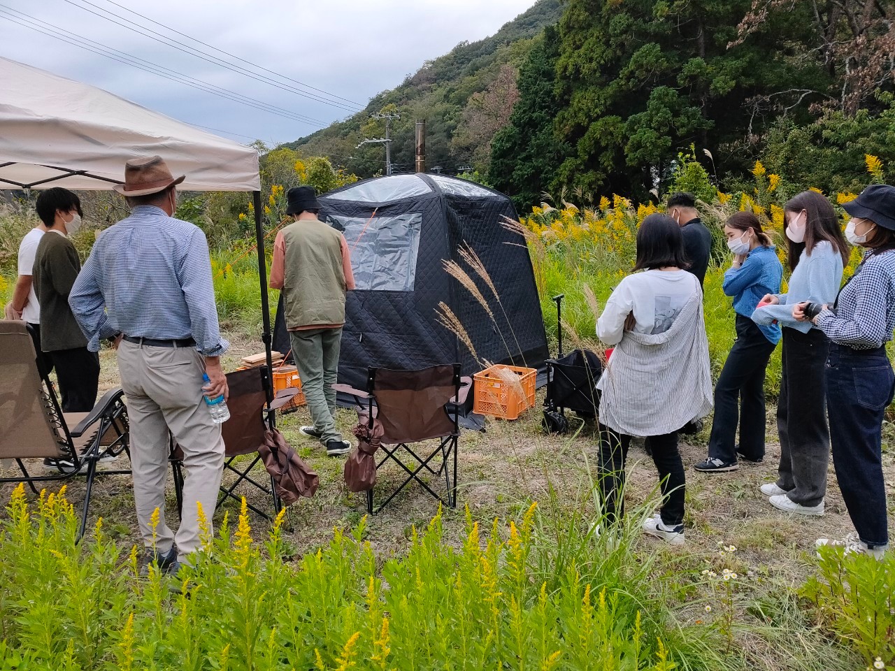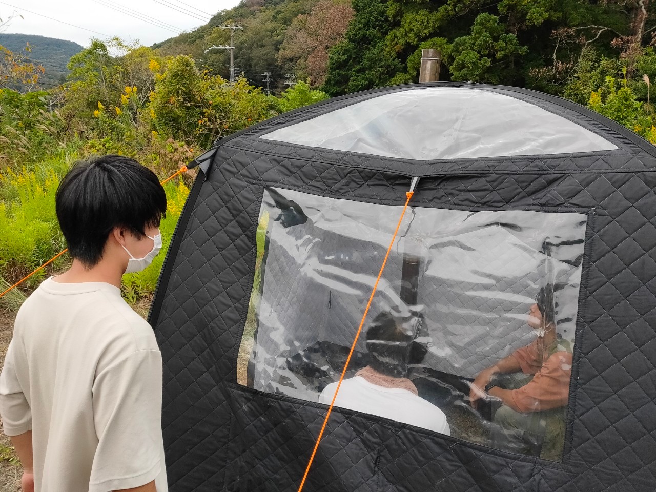龍谷大学政策学部連携班のみなさんは、地域おこし協力隊と一緒に検討を進めているテントサウナを活用した観光資源の開発の取り組みの1つとして、設営体験を竹原集落で行いました。